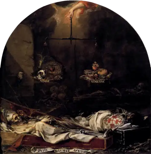 Finis Gloriae Mundi is an oil painting made by Juan de Valdés Leal between 1670 and 1672, and along with In Ictu Oculi, both were commissioned by Miguel Mañara to be placed below the choir of the church in the Hospital de la Claridad in Seville. Its dimensions are 220 x 216 cm finishing in an arc on the top. Both paintings together are also named "The Hieroglyphs of Life's End" or "The End of Life".[1]