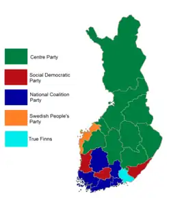 - ^ "Sunday Evening: Election Special – Massive gains for True Finns and a bad night for the Centre Party, as Finland experiences sweeping protest vote. National Coalition will be largest party". Helsingin Sanomat. 18 April 2011. Archived from the original on 10 August 2011. Retrieved 12 July 2011.