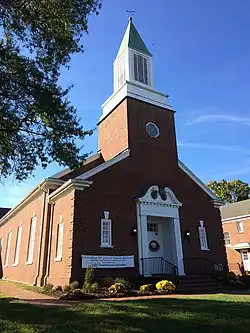 The congregation of First Baptist was founded on November 6, 1841.[2] On June 28, 1849, two half-acre plots were purchased in Rockingham County, North Carolina, and another plot purchased on February 13, 1851, for the use of a church. Original documents of the Church were destroyed in a fire, but it is believed the building was completed in 1850. The original building was renovated in 1955. The church, built during the Antebellum period, provided a gallery seating for slaves who attended religious services with their plantation masters, many of whom were tobacco planters. The slave gallery was removed in the 1890s. Following primitive baptist tradition, preaching was held every fourth Saturday and Sunday of the month instead of weekly. The congregation performed baptisms in the Dan River. Silver goblets, silver plates, and a silver pitcher were used for Communion services from 1891 to 1919, which were later purchased by the Ladies Missionary Society. The church was a member of Beulah Association for fifty years before joining the Pilot Mountain Association in 1891.[3] It remained a member of that association until the Dan Valley Missionary Baptist Association was formed in 1947.[4]