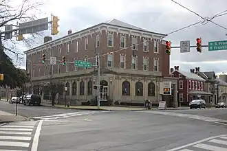 It was built in 1898 and remodeled to its present form between 1919 and 1921. It is a three-story, red brick building with a stone front measuring 50 by 125 feet (15 by 38 m) in a vernacular Renaissance Revival style. It was originally built as a store and light manufacturing facility, but converted to use as a bank at the time of remodeling.[2]