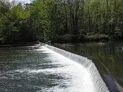 There are five dams on Fishing Creek.[41] The lowhead dam called Boone's Dam is the furthest downstream, in Montour Township.[27][41] It is 4.5 feet (1.4 m) high and 253 feet (77 m) long. Further upstream is the Diverting Dam, a 2-foot (0.61-meter) high and 100-foot (30-meter) long dam in Bloomsburg.[41] It was built to power the nearby Irondale furnaces.[27][42] A 380-foot (120 m) wide and 5-foot (1.5 m) high unnamed dam is on the creek further upstream, in Mount Pleasant Township. The uppermost dams are the 130-foot (40 m) wide and 11-foot (3.4 m) high Benton Dam and the 150-foot (46 m) wide and 6-foot (1.8 m) high Mill Dam, which are in Benton Township and Benton. Additionally, the Jonestown Dam is on the tributary Huntington Creek in Jonestown. This dam is 8 feet (2.4 m) high and 120 feet (37 m) wide.[41]