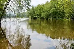 Northern Bloomsburg and Scott Township include a small oxbow lake of Fishing Creek; the area around this lake is known as the Turkey Hill Oxbow.[22] The lake is located between Interstate 80 and the forests on the side of Turkey Hill. The oxbow is on a flood plain and includes grasses, forested wetlands, and areas of open water. In wet periods of the year, the Turkey Hill Oxbow lake receives overflow from the waters of Fishing Creek while during dry periods it contains water in only a few places.[23]