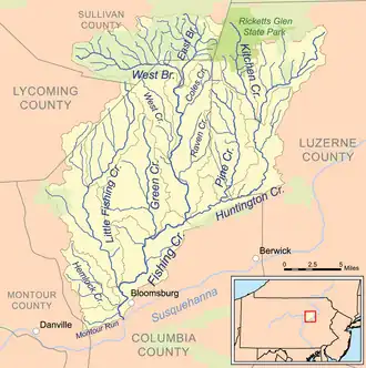 Fishing Creek drains most of Columbia County north of the Susquehanna River except for an area in the eastern part of the county, which is drained by Briar Creek.[20] It also drains southern Sullivan County and western Luzerne County. Minor tributaries drain small portions of Montour County and southeastern Lycoming County.[12] The upper part of the watershed is 85 percent forest and 13 percent farmland. Near its source, the other two percent is residential; closer to Benton, the remainder is urban.[21] The creek's drainage basin consists of a number of sub-watersheds. The largest ones are the Huntington Creek watershed, with an area of 114 square miles; the Little Fishing Creek watershed, with an area of 68.1 square miles; the Green Creek drainage basin, with an area of 36.9 square miles; and the West Branch Fishing Creek drainage basin, with an area of 32.9 square miles.[3]