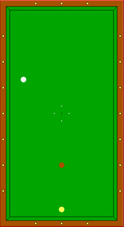Like most other carom games, five-pins requires three standard carom billiard balls of equal diameter: a cue ball for the first player, typically plain white, another cue ball for the second player, historically white with a spot but now typically yellow, and a red object ball,.[7][2] The balls are 61.5 millimetres (2.42 in) in diameter and weigh between 205 and 220 g (7.2 and 7.8 oz); 7.5 oz is average).[7][8] The white cue ball is given to the starting player, who may place it anywhere on the head side of the table (without disturbing the pins)—i.e., anywhere unobstructed between the head rail and the center string. The red object ball is placed at the foot spot (i.e., the intersection of the foot string and the long string. The yellow (or spotted white) cue ball of the opponent is placed on the long string, in a position that can be labelled the "foot rail spot", 10 cm (approx. 4 in) from the foot rail.[9][10]