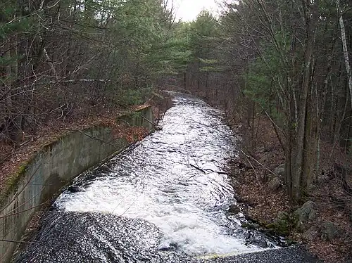 The Five Mile River is a short river that connects the outflow portion of Brooks Pond located at the boundary between the towns of North Brookfield and Spencer, and Lake Lashaway located downstream in North Brookfield. The river is a tributary, via the East Brookfield River, to the Quaboag River and is part of the Chicopee River Watershed. The Five Mile has been harnessed as a source of power for saw and grist mills and colonial foundry according to historical documentation. The proximity to iron ore, power from Brooks Pond (previously known as Johnson's Pond and North Pond), to power an air-blast bellows, and nearby abundance of wood (for charcoal), made the Five Mile River a good location for blast furnace and iron works operated by Jonathan and Nicholas Jenks in 1782. "Two Gilberts joined the enterprise and still later the venture was split in two--two furnaces, two forges etc.-each family operating one."