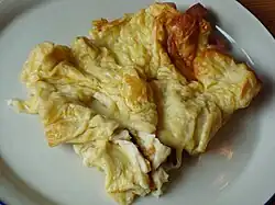 Fläskpannkaka is a Swedish oven-made pancake baked from eggs, milk, flour, salt (similar to a Yorkshire pudding) containing pieces of sliced pork or bacon. The ingredients are placed in a pan and baked in the oven. It is commonly served with lingonberry jam. Varieties of the dish contain onion, apples, blueberries or garlic. [1]