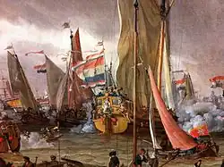 Images of various white-blue-red Russian flags are present in the three later paintings of Abraham Storck's workshop dedicated to the arrival in Amsterdam of Peter I. Peter I took part in a practice battle on the river IJ while on board the yacht of the Dutch East India Company.[19] In the paintings of Abraham Stork depicting the show fight, this yacht sails under the white-blue-red flag with a double-headed eagle, or under a white-red-blue pennant and a white-red-blue aft flag with a double-headed eagle.