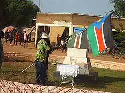 The flag of South Sudan was adopted following the signing of the Comprehensive Peace Agreement that ended the Second Sudanese Civil War.[2] A different version of the flag was previously used as the flag of the Sudan People's Liberation Movement. The flag of South Sudan predates the country, as the flag was adopted in 2005, while the country became independent in 2011.[3][4]