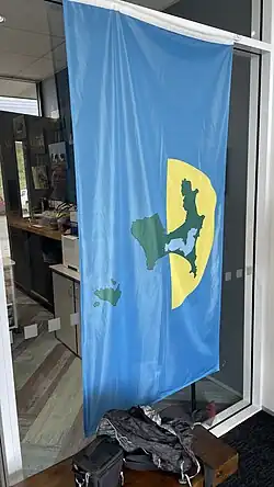 The unofficial flag of the Chatham Islands (Wharekauri in Māori; Rēkohu in the indigenous Moriori language) is a blue field with a map of the island in the centre, the Te Whanga Lagoon depicted in white.[1] Behind this device map is a depiction of the rising sun, an allusion to its local name Rēkohu, meaning 'rising sun'.