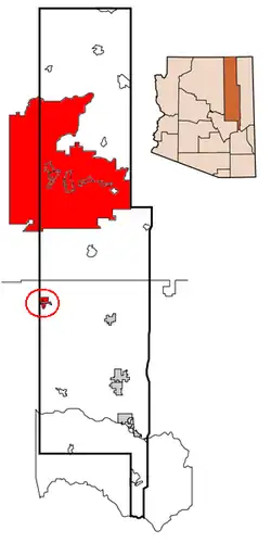 The flag of the Hopi Tribe is used by the Native American Hopi Tribe of Arizona in the United States who live on the Hopi Reservation. The flag is a vertical tricolour of turquoise, white, and yellow, with the Hopi symbol in the middle.[2] The flag is accompanied by a red fringe.[1] The Hopi reservation is surrounded by the Navajo Nation, which is the largest tribe.