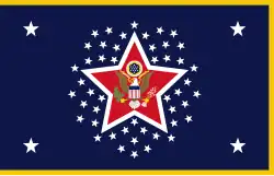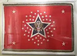 The flag was scarlet, with a large blue star in the middle outlined in white which contained the Great Seal. There were four white stars, one in each corner, and scattered between the angles of the large central star were 45 small white stars, representing the 45 states.[3] This flag was placed in the cabinet room in the White House during the war, and was first shown in public during peace jubilee celebrations in Chicago and Philadelphia in October, 1898.[22][24][25]