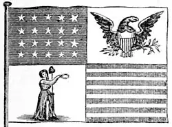 During the committee discussions which eventually led to the Flag Act of 1818, an additional flag was proposed which was to indicate the president's presence at places he visited. The design divided the flag into four quarters (like the British royal standard): the upper left was the white stars on a blue background (same as the national flag); the lower left had a Goddess of Liberty on a white background; the upper right had an eagle emblem on a white background, and the lower right had the thirteen red and white stripes. This flag was not seriously considered and was not adopted.[3][4][5] Samuel Chester Reid, who proposed this design, made a drawing of it years later which showed the eagle and Liberty in switched positions, and had the stars arranged in a larger star.[6]