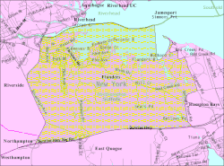 It is located in the town of Southampton on the south side of the Peconic River at its mouth in Peconic Bay, roughly at the start of the South Fork of Long Island. Riverhead is across the river to the north.