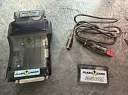 Games are written to the cartridge with a device called "linker". Depending on the brand of flash cartridge, the linker either connects to a link port on the console and writes to the cartridge through the console, or connects to a mini-USB slot on the cartridge itself and writes directly to the flash cartridge. These linkers usually connect to a PC through a USB or parallel plug on the other end. Most linkers that connect to a link slot are capable of copying ROM information from commercial software cartridges. Some more recent flash cartridges use digital media cards (SD, MMC, CF, etc.) in which files are placed via a memory card reader.