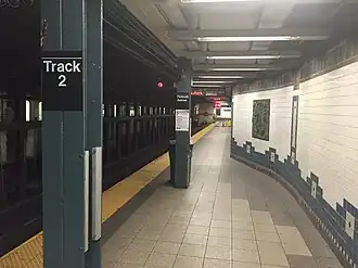 The station platforms have several doors for various non-public uses, including crew quarters.[38] A 2 train crew office is on the Track 3 side, and a 5 train crew office is on the Track 2 side.[39] There are public restrooms along Track 3 just within the station's main entrance.[40] The columns along the platforms are painted light-blue.[41]