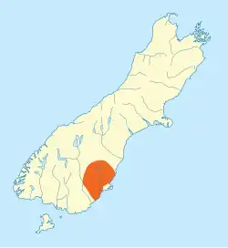 Approximate known distribution (in orange) of Galaxias depressiceps on a map of the South Island |