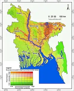 - ^ a b Uddin, Kabir; Matin, Mir A. (2021-10-01). "Potential flood hazard zonation and flood shelter suitability mapping for disaster risk mitigation in Bangladesh using geospatial technology". Progress in Disaster Science. 11 100185. doi:10.1016/j.pdisas.2021.100185. ISSN 2590-0617.