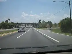US 17-US 92-US 441 (Orange Blossom Trail) serves as the western end of the U.S. Route 17/92 (SR 500/SR 600) concurrency. Here, US 17-92 (and SR 600) end their concurrency with US 441, and join SR 50, while US 441 and the Orange Blossom Trail move further northwest in Florida and beyond. A railroad line runs along the right side of this intersection, and the first feature along the US 17/92-SR 50 multiplex is a grade crossing. US 17/92 with SR 50 (and SR 600), meets the south end of Edgewater Drive and passes by Lake Dot Park and then Don Dudley Park before it crosses Interstate 4 (SR 400; Exits 83B & 84) then crosses the SunRail tracks (former CSX A-Line) and State Road 527 (Orange Avenue southbound and Magnolia Avenue northbound) before meeting State Road 15(Mills Avenue), where US 17/92 turns north thereby marking the eastern end of US 17/92(SR 600) concurrency. Between Maguire Boulevard and Lake Barton, SR 50 runs along the northern border of Orlando Executive Airport, however the view of the airport is obstructed by numerous stores and shopping malls. Along this stretch, the road passes north of Colonial Plaza and south of Orlando Fashion Square. Across from Lake Barton is the western terminus of Old Cheney Highway, a former section of SR 50. East of this intersection is Little Lake Barton, and SR 50 begins to curve to the northeast, but not as sharply as the former segment. Lake Barton stretches from the vicinity of this intersection to the southwest corner of State Road 436 (Semoran Boulevard), which has had an interchange since 2010. The road continues its northeast curve into Azalea Park as it passes by the nearby Colonial High School named in honor of SR 50, it then intersects Old Cheney Highway a second time but then moves directly east again before the intersection with State Road 551(Goldenrod Road)