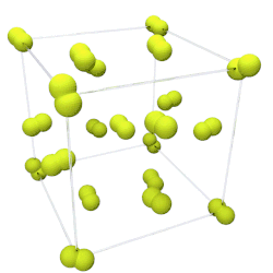 Animation showing the crystal structure of beta-fluorine. Molecules on the faces of the unit cell have rotations constrained to a plane.