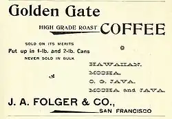 The precursor of the Folger Coffee Company was founded in 1850 in San Francisco, California, as the Pioneer Steam Coffee and Spice Mills. Prior to that Californians had to purchase green coffee beans and roast and grind them on their own. The mill’s founding owner, William H. Bovee, saw the opportunity to produce roasted and ground coffee ready for brewing.[5] Bovee hired newly arrived 15 year old carpenter J. A. Folger to help build his mill. Folger had come from Nantucket Island with his two older brothers during the California Gold Rush. In the 1850s, kerosene became a cheaper alternative to whale oil, Nantucket's dominant business. Many Nantucket ships were re-purposed to instead bring coffee from South America to San Francisco.[6] After working at Bovee's mill for nearly a year, Folger had saved enough money to buy part of the company, and went to mine for gold. He agreed to carry samples of coffee and spices, taking orders from grocery stores along the way. Upon his return to San Francisco in 1865, Folger became a full partner at Pioneer Steam Coffee and Spice Mills. In 1872, he bought out the other partners and renamed the company J.A. Folger & Co.