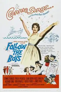Follow the Boys is a 1963 American comedy film directed by Richard Thorpe[1] and starring Connie Francis, Paula Prentiss, and Janis Paige,[1] released by Metro-Goldwyn-Mayer. Shot on location on the French and Italian Riviera, Follow the Boys was MGM's second film vehicle for top recording artist Francis following Where the Boys Are (1960). While Francis' role in the earlier film had been somewhat secondary, she had a distinctly central role in Follow the Boys playing Bonnie Pulaski, a newlywed traveling the Riviera.