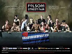 For the 24th annual event held on September 30, 2007, the official poster artwork was a photo featuring well-known LGBT and BDSM community members in festive and fetish attire including Sister Roma "as players in an innovative version of the culturally iconographic" The Last Supper by Leonardo da Vinci, complete with a table draped with the Leather Pride flag and "cluttered with sex toys, whips, and various (BDSM) restraints".[33] The image by FredAlert[34] was used on the official event guide and produced as collector's posters that were displayed throughout the city as advertising for the event. Some conservative religious groups criticized the image as anti-Christian and blasphemous, although media outlets noted that parodies and homages of the "Last Supper" painting like Renée Cox's Yo Mama's Last Supper are numerous, including ones by The Simpsons, The Sopranos, Phish, That '70s Show, Robert Altman (in the film MASH) and the Boston Red Sox.[35][36] Chris Glaser, a gay clergyman and interim senior pastor at San Francisco's Metropolitan Community Church opined that "they are just having fun" with both the painting and the notion of 'San Francisco values,' and called the poster "tastefully and cleverly done".[34]