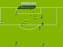 The players can perform tackles, bicycle kicks, volleys, one–two passes, diving headers, and aftertouches, jump over ("ride") opposing characters' tackles, and execute speed bursts.[4][6] Tapping the shoot button makes a character pass the ball; holding it down longer strengthens the pass and eventually turns it into a shot.[4] Goals are celebrated by the characters and sometimes by fans, who throw fireworks onto the pitch.[7] Highlights—including goals and injuries—evoke commentary and reactions from other characters via speech bubbles.[2][3][4] Instant replays displayed in a picture-in-picture window show the last few seconds leading up to these events.[8][9] In the Amiga version on systems with the Amiga Advanced Graphics Architecture (AGA), this replay runs simultaneous to the gameplay.[2] In the case of injuries, the game is interrupted by the team's coach and, for severe injuries, paramedics, who take away the injured character on a stretcher.[2] If a player disagrees with a refereeing decision, they can chase down and argue with the referee.[1] Dogs, streakers, and hooligans occasionally interrupt the game, the latter two in pursuit by police.[1][2] Whole matches can be saved and, upon review, replayed from any point.[2]
