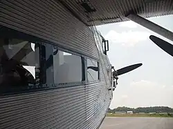 The original (commercial production) 4-AT had three air-cooled Wright radial engines. It carried a crew of three: a pilot, a copilot, and a stewardess, as well as eight or nine passengers [N 1].[3] The later 5-AT had more powerful Pratt & Whitney engines. All models had an aluminum corrugated sheet-metal body and wings. Unlike many aircraft of this era, extending through World War II, its control surfaces (ailerons, elevators, and rudders) were not fabric covered, but were also made of corrugated metal. As was common for the time, its rudder and elevators were actuated by metal cables that were strung along the external surface of the aircraft. Engine gauges were also mounted externally, on the engines, to be read by the pilot while looking through the aircraft windshield.[3] Another interesting feature was the use of the hand-operated "Johnny brake."[8]