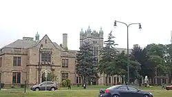 The campus has a Gothic Revival style design.[5] The exterior of Fordson is made of granite and uses Briar Hill sandstone trim. The library has hand carved oak paneling, a fireplace, painted wall murals by Zoltan Sepeshy, tapestries and Jacobean fumed-oak furnishings and many bronze and marble statues including Athena, Apollo, Artemis, Nike, Niobe, Venus, and Mercury. The main entrance has ten busts that include philosophers, playwrights, and mathematicians like Plato, Aristotle,[5] Aristedes, Sophocles, Homer, Demosthenes, Aesculapius, Euripides, Pindar, Archimedes, and Socrates.[5] The main hall also includes a blue and gold Fordson Tractor with lettering of state champions imprinted on its top.[13] The building features architectural sculpture by Corrado Parducci. Fordson's architecture was represented in the 1987 film The Rosary Murders when the library and tower were displayed. The school became recognized as a Michigan Historical Site in 1998.