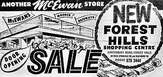 Pratt and company were eager to open a supermarket at Forest Hill, but the promising deal came with a catch: Pratts could occupy the site if they arranged for McEwans Hardware to lease a large adjacent store. This turned out to be relatively easy as the Pratts Group had previous dealings with McEwans management. Once this was finalised, the developers secured the Moores department store chain to be the third anchor tenant.[28] Australian Safeway Limited, the Australian division of America's famous Safeway chain of supermarkets, partnered with Pratts to open the first "Safeway" branded supermarket in the country at Forest Hill. This had 12 checkout points and a staff of more than 50 assistants, making it the second largest grocery store in Australia.[29][30]
