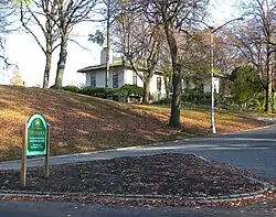 When the park was established, the westernmost portion, about 200 feet (61 m) east of the western border, had a plateau measuring several hundred feet across. The park's two main roads, Forest Park Drive and Forest Parkway, intersect on this plateau.[13] Near this intersection, across from Oak Ridge, is a grove of trees that was planted in 1919 in memory of Queens residents who had died fighting in World War I.[49][48] There were originally 53 trees, but the grove was expanded over the years to 70 trees; there is a plaque nearby with the names of residents who died during the war.[49] Until the 1930s, the Woodhaven neighborhood's annual Memorial Day parades ended outside this grove.[49][48]