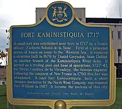 In 1685 Daniel Greysolon, Sieur du Lhut built a post nearby. In 1688 Jacques de Noyon went from Kaministiquia as far as Rainy Lake. In 1696 the post was abandoned along with many western posts when the system of fur trade permits (congés) was abolished due to a surplus of beaver.[1] In 1717 Zacharie Robutel de la Noue was sent west to find the western sea. It is not clear how far inland he got but he seems to have established Fort Kaministiquia and remained there until 1721. Coureurs des bois seem to have spread out from the fort, but we only know of them from rumors picked up by the English on Hudson Bay. Morton[2] thinks they may have gotten as far as Lake Winnipeg. From 1919 it was one of the postes du nord which included a post on the Nipigon River and one at Michipicoten. La Vérendrye took over the postes du nord in 1728 and in 1731–1743 he pushed trade and exploration west beyond Lake Winnipeg, mainly via Grand Portage using Kaministiquia as a base. It was abandoned in 1758 or 1760 with the fall of New France.