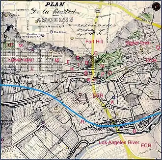 3. ^ Sunset Boulevard/César Chavez Avenue was not cut through until around 1900, by which time much of Fort Hill had been dug away.