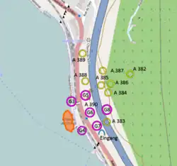The Fort de Chillon lies directly adjacent to the Château de Chillon, a major tourist attraction. The site has been fortified since at least the 12th century. The Fort de Chillon is a mixed infantry-artillery fort, located almost entirely underground in the steep slope rising to Veytaux above the rail line.[1][2] The location is spanned by the Viaduc de Chillon. Built at the opening of the Second World War (1941),[3] it was armed with a mixture of 75 mm guns and 90 mm anti-tank guns.[4] Initial work was completed in 1942. The fort was designated A390 in the Swiss fortification nomenclature.[2] The ensemble included permanent and rapidly deployable anti-tank obstacles, designed to stall or trap an enemy while the fort's weapons fired on them.[5]