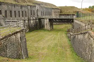 The Fort de Vézelois is similar to the Fort de Bessoncourt and was designed to support Bessoncourt and the Fort du Bois d'Oye, covering the road from Basel and the Mulhouse railway line. It was garrisoned by between 500 and 600 men. The fort received concrete cover in 1888–89, its artillery dispersed to batteries outside the fort. In 1909 the caponiers were replaced by counterscarps. Parapets and a subterranean shelter were provided for infantry, while a casemate, two machine gun turrets and a 75mm gun turret were added.[2] From 1893 the fort was linked to other forts around Belfort via the Chemins de fer du Territoire de Belfort strategic railroad.