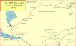The Forth and Clyde Junction Railway was incorporated by Act of Parliament on 4 August 1853;[2][3] the line was to be 30 miles (48 km) in length, and the trunk haul traffic, minerals westbound to the Clyde and manufactured textiles from the Leven dyeworks eastbound, was to be dominant.