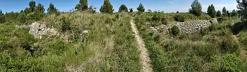 The threat of a further invasions by the French led Wellington, on October 20, 1809, to order the secret construction of defensive lines in order to protect Lisbon from Napoléon Bonaparte's troops led by Marechal Masséna.[5] A total of 152 military installations were constructed, armed with 534 cannon and garrisoned with about 34,000 troops.[6] Each work was given a number and the three forts discussed here were Numbers 40-42.[3] They were built at the top of the Aguieira mountain range, providing excellent views of the surrounding area and of the River Tagus.[1]