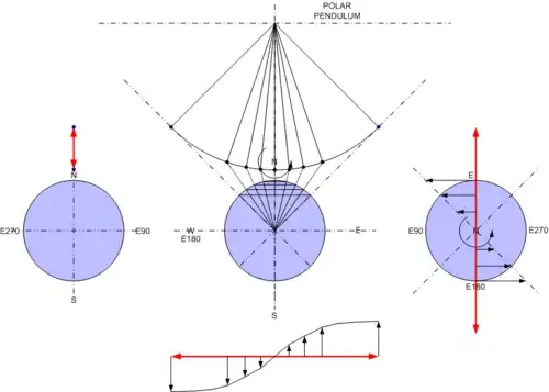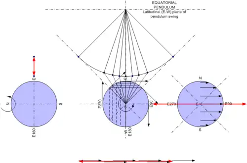 For the equatorial pendulum with a swing in the longitudinal (north-south) direction the surface velocity vectors on either side of the swing are balanced in the same direction and the center-point of the pendulum swing is moving along with the direction of rotation (see Figure 2A).