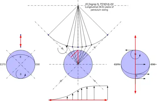 - Using the same projection for the 45° North pendulum with longitudinal swing (Figure 3B) the velocity vector is 1 EVU but the z-component is only 0.707 EVU since the x-y plane is at 45°on one side of the swing (corresponding to the equator). On the other side of the swing the velocity vector is 0.707 EVU in the opposite direction (corresponding to the equator with a tilt of 45° to the x-y plane). The difference between these two vectors is 1.414 EVU.