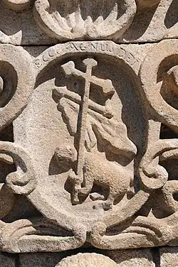 The inscription stones on either side of the Agnus Dei are inscriptions. To the left, in Latin: MARIA I LUSITANORUM RE..NAE.. GRATIA JOANNE PETRO SA.. PUBIEIDO IN HOC MELGA..NSI OPPIDO FORMSI IU DICE SE NATUS PRESIDE CONDE FORA... QUE TAN..UAM IN CA.. TREITORII CONSTITUTE .. COND..UN HOC FUET EDICTO ..DUSTIMAQUE HUIUS MAGISTRATUR ANA MDCCLXXX; to the right in Portuguese: ESTA OBRA MANDOV FAZER O DOVTOR JOÃO PEDRO DE SALES CAVALEIRO JUIS DE FORA COMP..CAMENTO DE CA.... DE COMARCA NESTA NOTAVEL VILA DE MELGAÇO À SUA CUSTA E DA NOBREZA .... Aboves these inscriptions are carved: NOM MUNDATUR AQUIS SED AQUA ... HIC MUNDAT.... ; TINGE RUE NON ICITUR DOMINUM BAPTISTA RECUSE... CRIMINIBUS NOS ...QUE..ZAVA .. RA PARAT.