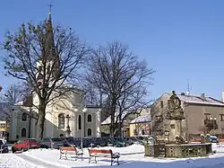 The landmark of the town is the Church of Saint Bartholomew, built in 1672–1690. Other monuments at the town square are the neo-Renaissance town hall from 1894 and a Baroque Marian column with a rare statue of the Virgin Mary of Carmel from 1731.[8]