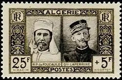Laperrine entered the École Spéciale Militaire de Saint-Cyr in October 1878 and became a captain in the 2nd Dragoons in November 1891. Laperrine organized the Compagnie Méharistes Sahariennes in 1897.[1][2] He was a friend of Charles de Foucauld who was killed in 1916 in Tamanrasset.[3][4] The two were honored on a stamp of Algeria in 1950.