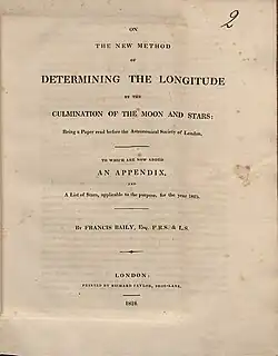 The reform of the Nautical Almanac in 1829 was set on foot by his protests. He was elected a Foreign Honorary Member of the American Academy of Arts and Sciences in 1832.[6] He recommended to the British Association in 1837, and in great part executed, the reduction of Joseph de Lalande's and Nicolas de Lacaille's catalogues containing about 57,000 stars; he superintended the compilation of the British Association's Catalogue of 8377 stars (BAC, published 1845);[7] and revised the catalogues of Tobias Mayer, Ptolemy, Ulugh Beg, Tycho Brahe, Edmund Halley and Hevelius (Memoirs R. Astr. Soc. iv, xiii.).[2]