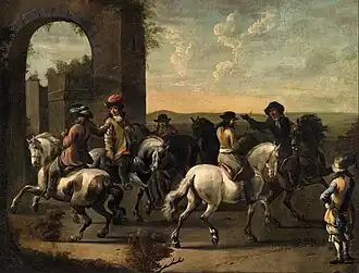 Hamers' artistic activity can best be characterised at that of a 'dozijnschilder' (literally 'dozen painter'), the name given to Antwerp painters in the 1670s who due to the economic downturn caused by the French invasions, created works for the market which imitated, borrowed from and copied other artists. In particular works of notably Dutch painters such as Philips Wouwerman, Pieter van Laer and Nicolaes Pietersz. Berchem were often the inspiration for these artists due to the market demand for battle and hunting scenes at the time. These works were produced in large quantities and distributed internationally to France, Austria, Spain and Portugal through art-dealers such as Guillam Forchondt and Bartholomeus Floquet.[3]
