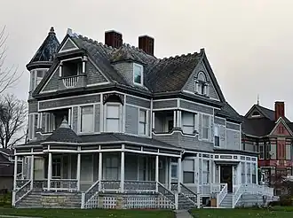 The Frank G. Ray House & Carriage House, also known as Ray Towers, is a historic residence located in Vinton, Iowa, United States. Ray was a local businessman who was associated with the Iowa Canning Company, the largest corporation in Benton County and a major employer in the region.[2] His 2½-story frame Queen Anne house features a complex composition that includes a wraparound front porch, three decorative chimneys, a three-story round tower, porte-cochère, and small porches at various places on all stories. The carriage house features decorative shingles and an irregular roofline that is capped with a cupola and weather vane. They were listed together on the National Register of Historic Places in 1982.[1]