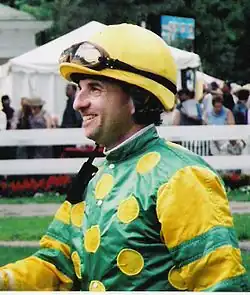 Frank "Frankie" Lovato Jr. (born January 30, 1963, in Cheverly, Maryland) is a retired American Thoroughbred jockey, inventor, and educator of horse racing. His racing career spanned from 1979 until 2004. Including one additional race in 2012, Lovato rode a total of 15,604 mounts, with 1,686 wins and finishing in the money on another 3,506. This total included wins in 111 stakes races at 25 different tracks. The horses he rode earned a total of $41,795,367.[1] In 1980 he won the Eclipse Award for Apprentice Jockey.[2] He later went on to invent a horse riding simulator called the Equicizer and founded an educational and training program called Jockey World.