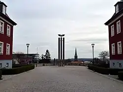 The bus station is located on the station forecourt in front of the entrance building. The tram stops are located about 100 metres north of the entrance building at the underpass to Beresinchen (the Beresinchentunnel). From there, Bahnhofsstraße (station street) runs to the north over former railway-owned land towards the city centre. The former railway buildings were almost completely destroyed in World War II and were replaced by new buildings. Between the bus station and the tram stop is the newly reconstructed "City Residence Hotel Frankfurt Oder". The Kiliansberg settlement on the east side of the station forecourt was built about the same time as the reconstruction of the station between 1922 and 1924 and was also designed by Beringer. It is located on a steep slope above the Oder valley and was built by the Ostmark company with apartments for railway workers as part of the transfer of the Deutsche Reichsbahn divisional administration to Frankfurt. Between the apartments designed by Beringer is a monument made by the sculptor Furstenberg for 1535 railwaymen who died in the First World War. Railway apartments and the monument are on the list of cultural monuments of Brandenburg.[14]