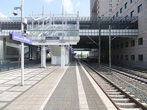 Frankfurt am Main Messe station (German: Bahnhof Frankfurt am Main Messe) is an S-Bahn station in Frankfurt am Main, Germany, in the district of Bockenheim in the middle of the Frankfurt Trade Fair grounds. The station was opened in 1999 to improve the fair's public transport connections. It consists of two platform tracks facing a central platform. Constructing the platform was a complex procedure as the space between the tracks had to be enlarged. The road next to the line had to be moved and a bridge had to be rebuilt.