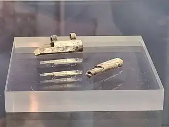 Among the burials was a man aged approximately 35 to 45.[8] Beneath his chin, archaeologists found a silver amulet capsule measuring 35 mm (1.4 in) in length and 9 mm (0.35 in) in width. Inside the capsule was a rolled, folded, and crumpled silver foil, 91 mm (3.6 in) long. Based on burial goods, including an incense burner and a mug made of baked clay, the burial was dated to between 230 and 270.[9][7][8][a] Isotopic analysis of the remains, aimed to determine the man's origins, are underway; however, as of 2024, the results of that analysis are pending.[3]