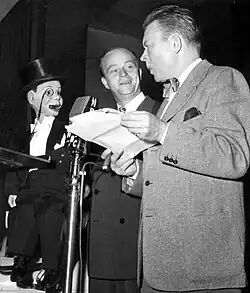 His best-remembered gag was his long-running mock feud with friend and fellow comedian Jack Benny, but that was only part of his appeal. Radio historian John Dunning wrote that Allen was perhaps radio's most admired comedian and most frequently censored.[3] A master ad libber, Allen often tangled with his network's executives and often barbed them on the air over the battles while developing routines whose style and substance influenced fellow comic talents, including Groucho Marx, Stan Freberg, Henry Morgan, and Johnny Carson; his avowed fans also included President Franklin D. Roosevelt, humorist James Thurber, and novelists William Faulkner, John Steinbeck, and Herman Wouk, who began his career writing for Allen.